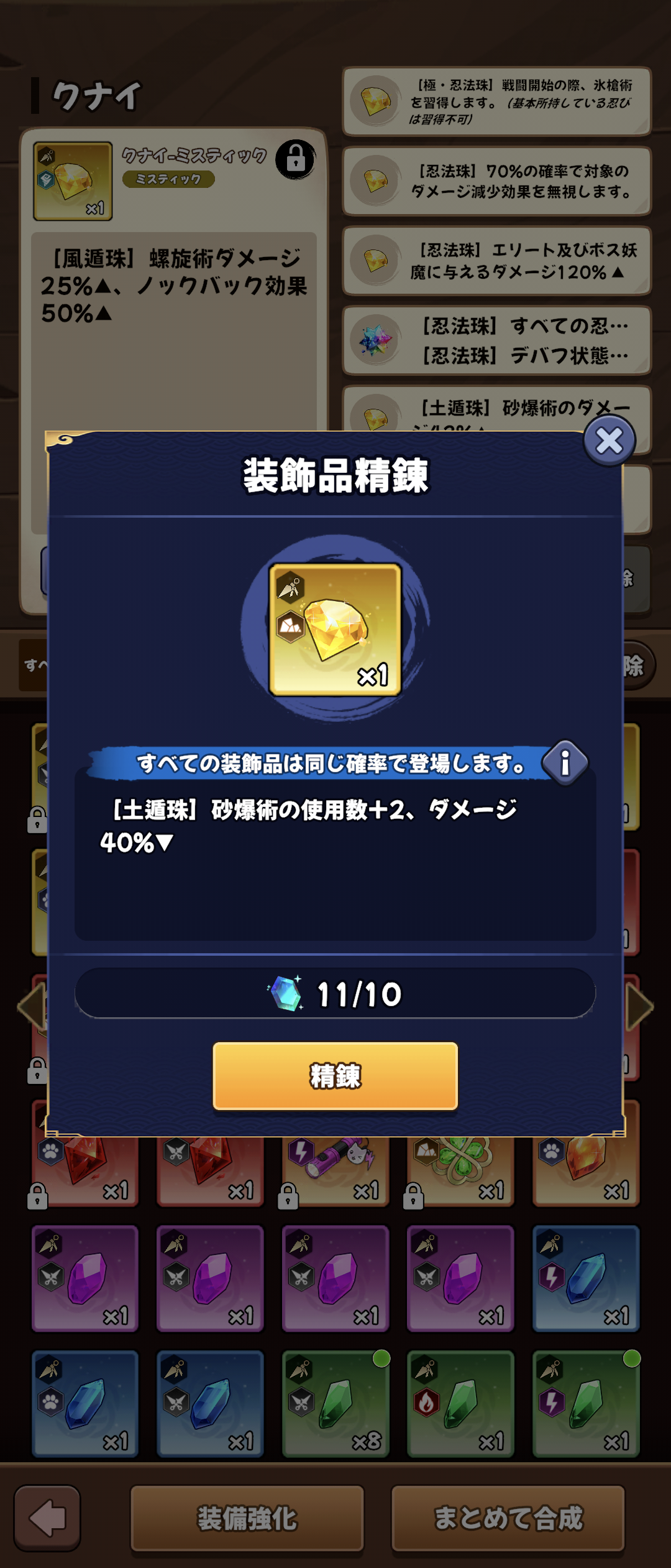 | 【極・忍法珠】戦闘開始の際、ダメージが❶%減少した砂爆術を習得します(基本所持している忍びは習得不可) | ❶0% ❶20% ❶40% ❶60% × × × | -- -➡ -- |
