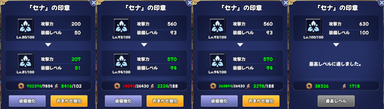• 基本的にコイン💰は常に足りないので、装備強化・忍術強化のどちらに投資するかのバランスには要注意(強化する忍術は極力使うものだけに絞った方がいい)