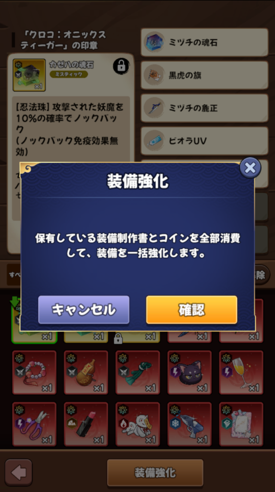 「妖魔の波を撃退する度○%回復」 最大ユニーク 4 頭巾・上着・靴 「中ボスとボスを倒すと○%回復」 最大ミスティック 18 頭巾・上着・靴 「雑魚を1匹倒す度○ポイント回復」 最大ミスティック 7 クナイ